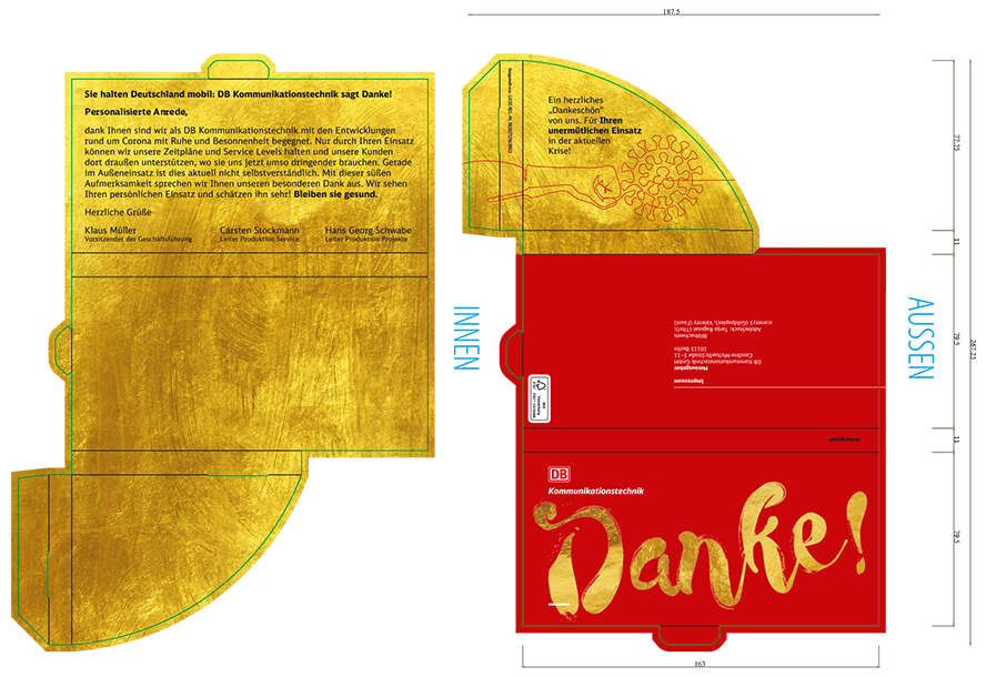 Das Layout und die Gestaltung wurden mit viel Liebe zum Detail von mir mit Adobe Photoshop, Indesign und Acrobat Pro erstellt. Die personalisierten Anschreiben auf der Mappe zeigen, dass die Geschäftsleitung ihren Alltagshelden für ihren Einsatz dankt.